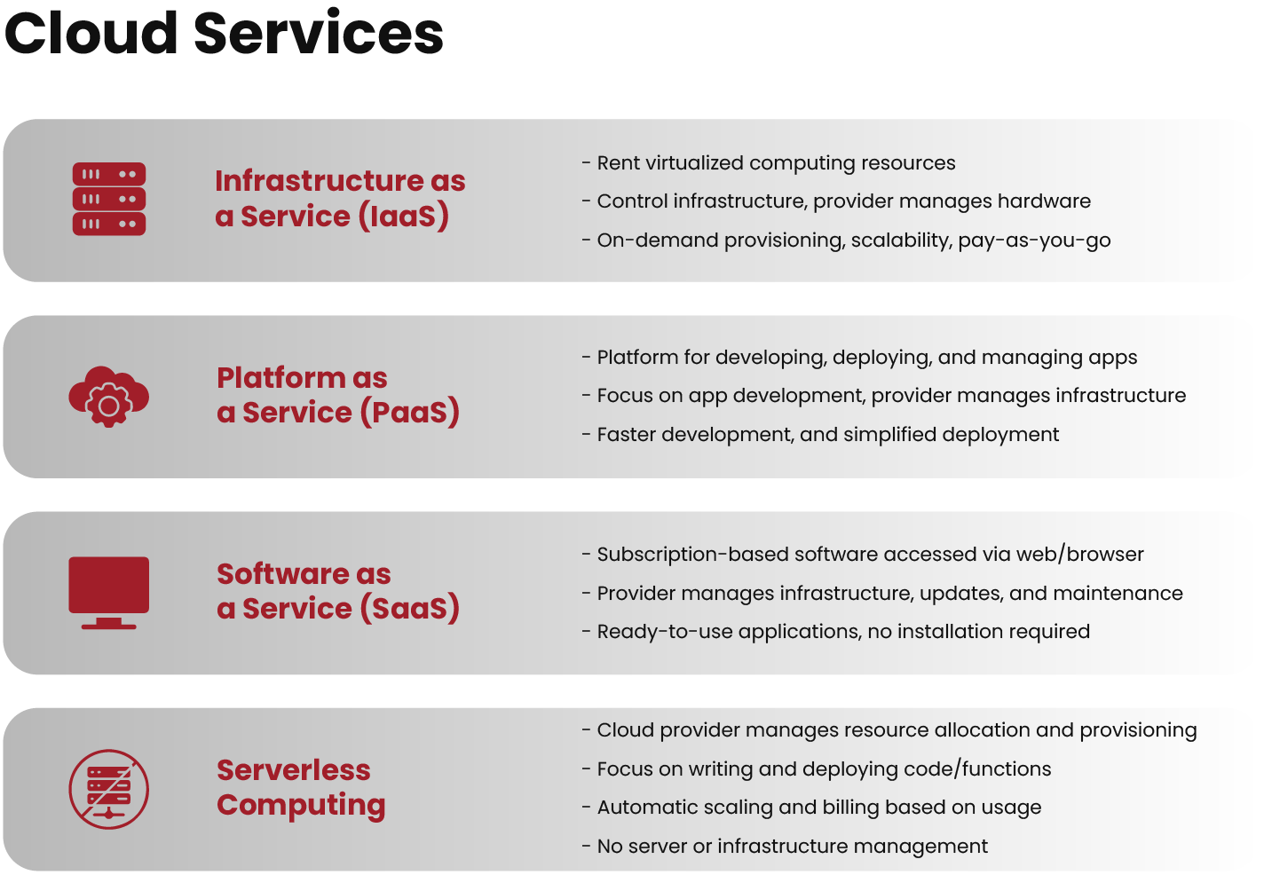 Based on the users’ demands, cloud computing exists in different forms and types. For instance, cloud services can be deployed on a public cloud, private cloud, or hybrid cloud. Furthermore, the most common models of computing services fall under the following categories: