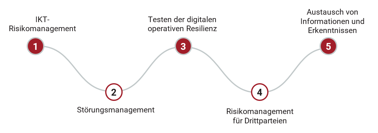 DORA legt die wichtigsten Anforderungen für Finanzunternehmen in fünf Hauptbereichen fest: