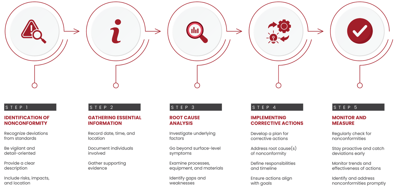Once the nonconformity is identified, gather all relevant information related to the incident. This includes recording the date, time, location, individuals involved, and any supporting evidence. Accurate and detailed information is crucial for understanding the context and scope of the nonconformity, as well as for conducting a thorough root cause analysis.