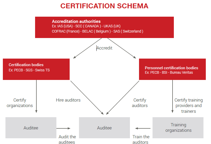 The following graphic shows the role of accreditation authorities and certification bodies: