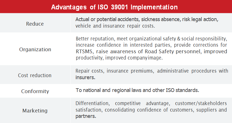 That is why implementing an internationally recognized standard such as the ISO 39001 will not only show your commitment to a safer society, but also improve your efficacy and guide your continual improvement with several advantages.