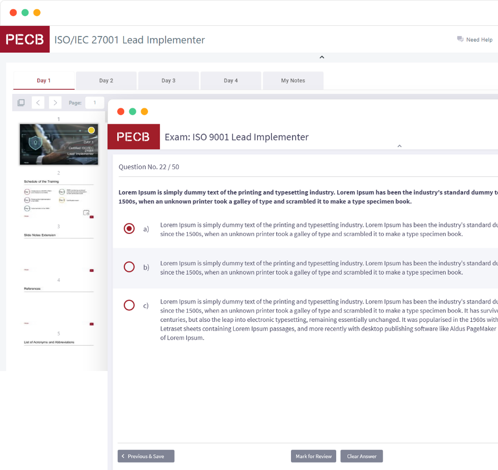 PECB Exams: Dedicated to our customers interested in taking a PECB certification exam online by freely selecting their convenient location, date, and time. Candidates taking a PECB online exam using this edition are remotely invigilated by PECB authorized Invigilators.