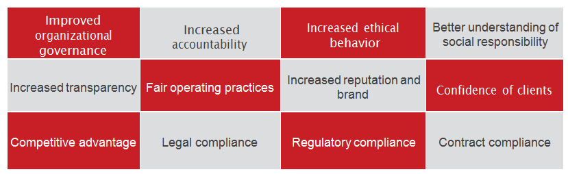 Reduced risk level of losing investors and customers by increasing their confidence in organizational performance;