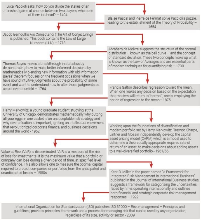 Mankind didn’t always perceive and understand the concept of “risk”, neither did it manage it in the way we do today. The figure below presents some of the major milestones that led to our understanding of the concept of risk, the development of risk management methodologies and the way we perceive and treat risks nowadays.