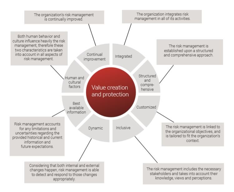 In addition to providing answers to such questions, ISO 31000 also provides a set of principles, a framework and a risk management process that the organizations can follow. The standard proposes 8 principles which organizations should consider when establishing their risk management framework and processes.