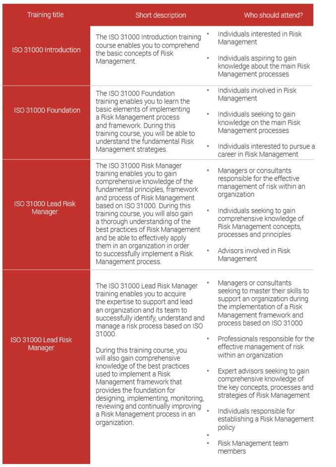 PECB training courses are offered globally through a network of authorized training providers and they are available in several languages. The table below gives a short description of the PECB official training courses for Risk Management based on ISO 31000.
