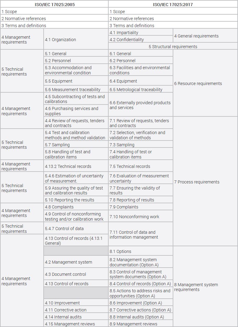 Table 1: ISO/IEC 17025:2005 to ISO/IEC 17025:2017 comparison matrix