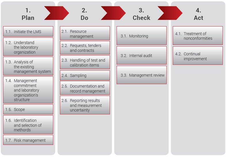 IMS2 is based on the PDCA cycle, which is divided into four phases: Plan, Do, Check and Act. Each phase has a number of steps which are further divided into activities and tasks. This ‘Practical Guide’ considers the key phases in the organization’s implementation project from start to finish. Constructively, it suggests the appropriate ‘best practice’ for each step while directing the organization as it embarks on its ISO/IEC 17025 journey.