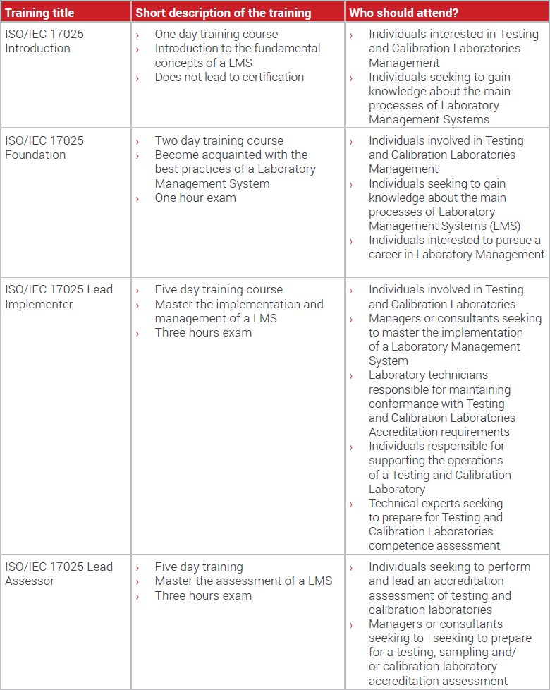 PECB has created a training roadmap and personnel certification schemes which are strongly recommended for implementers and assessors of a laboratory who wish to become certified against ISO/IEC 17025. The certification of individuals serves as documented evidence of professional competency, while also providing evidence that the individual has attended one of the related courses and successfully completed the exams. It also proves that the certified professional has the expertise to assist a laboratory in successfully obtaining an ISO/IEC 17025 accreditation.