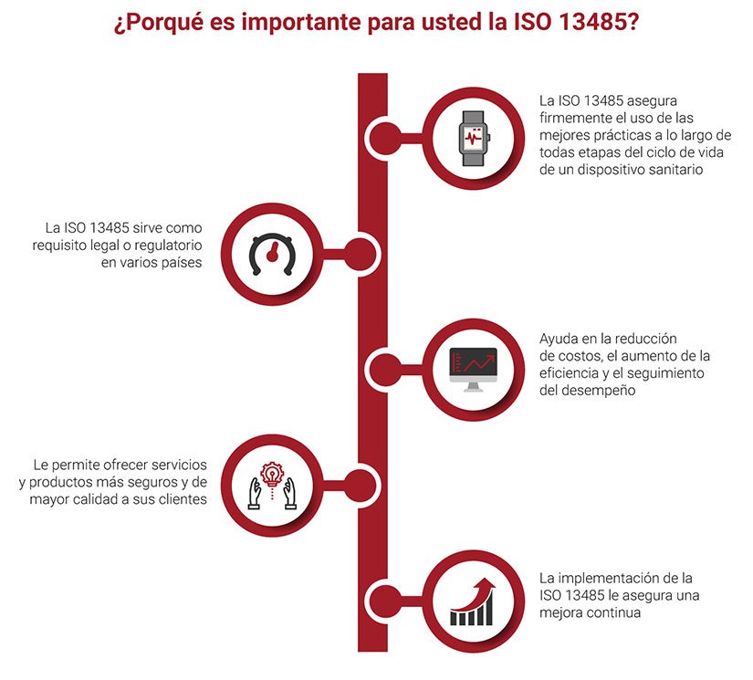 Como norma internacional, la ISO 13485 determina los requisitos para la industria de Productos Sanitarios. Esta norma fue creada para ser utilizada por las empresas durante el ciclo de vida de los productos sanitarios, desde la producción hasta la post-producción, incluyendo el desmantelamiento y la eliminación. Sin embargo, la ISO 13485 puede ser manejada por otras partes tales como los organismos de certificación que pueden ayudar en los procesos de certificación. La ISO 13485 sirve como una herramienta para que las organizaciones elaboren .y mantengan sus procesos de forma eficiente. Las organizaciones que buscan constantemente la mejora continua se verán beneficiadas con esta norma al estar en condición de proveer dispositivos médicos seguros y efectivos y ganarse la confianza de los clientes.