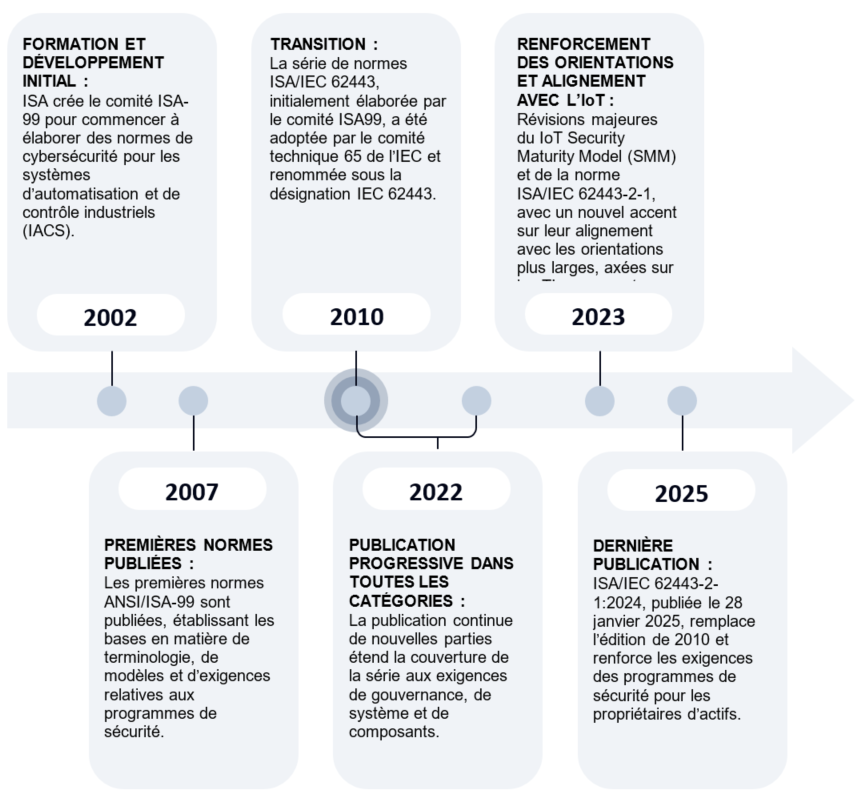 La série ISA/IEC 62443 constitue l’unique ensemble de normes, fondé sur un consensus mondial, couvrant l’ensemble du cycle de sécurité dédié à la protection des systèmes d’automatisation et de contrôle industriels (IACS). Rédigé conjointement par l’International Society of Automation (ISA) et la Commission électrotechnique internationale (IEC), cet ensemble de normes et de rapports techniques établit un vocabulaire unifié, un modèle de risque et un cadre de contrôle pour la cybersécurité industrielle dans divers secteurs, notamment la fabrication, l’énergie, l’automatisation du bâtiment, les dispositifs médicaux et le transport.