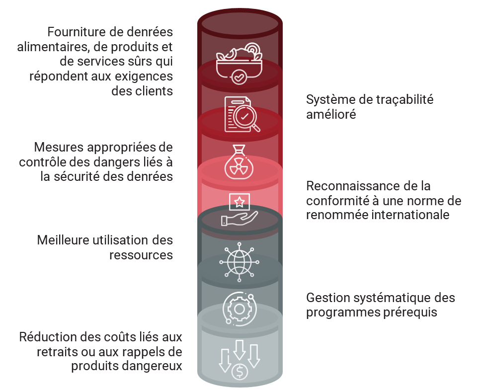 Un système de management de la sécurité des denrées alimentaires (SMSDA) basé sur ISO 22000 peut non seulement améliorer les mesures prises par un producteur de denrées alimentaires contre les maladies d’origine alimentaire, mais aussi renforcer sa crédibilité et sensibiliser davantage ses clients à la sécurité des denrées alimentaires.
